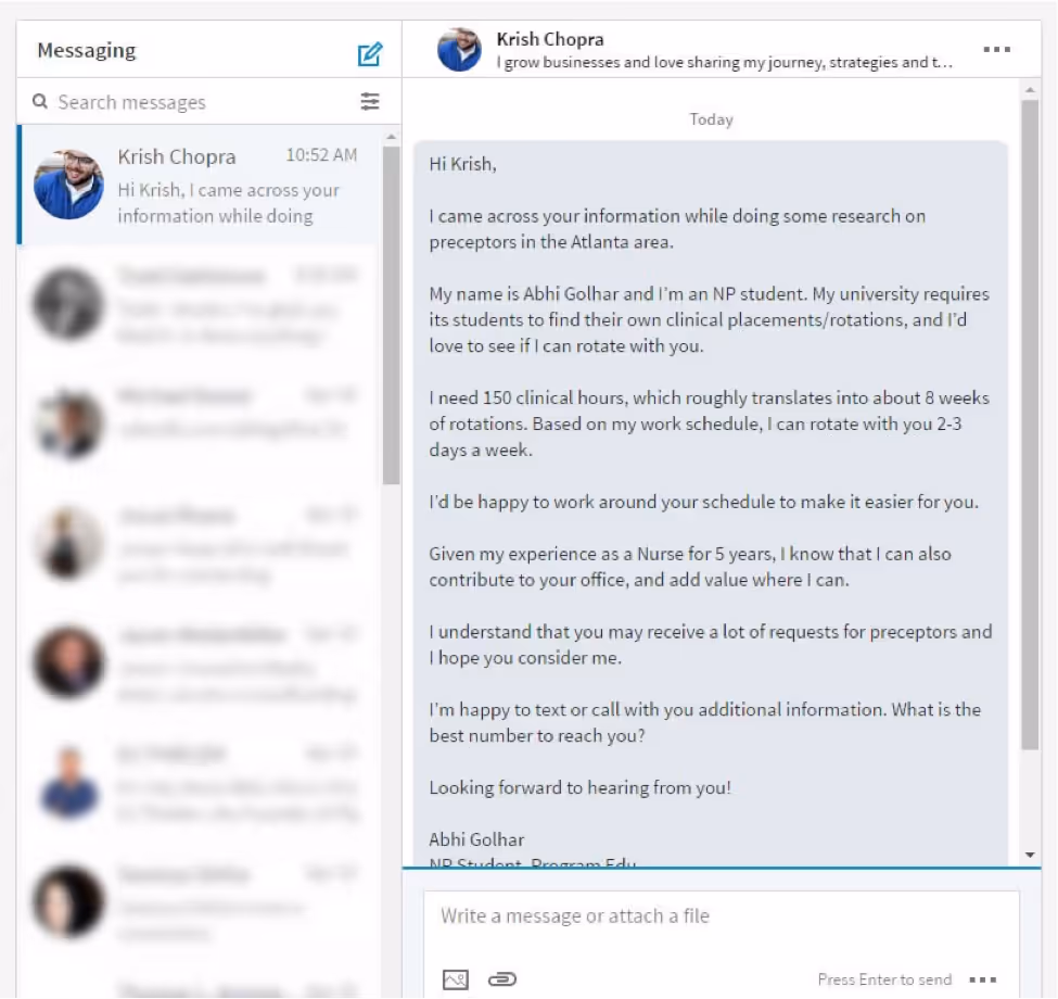 Emails have to be opened and read, but many LinkedIn messages are pushed directly to an individual’s phone. Remember, in order to get a confirmation for a clinical rotation, you need to have the attention of the office manager/preceptor.